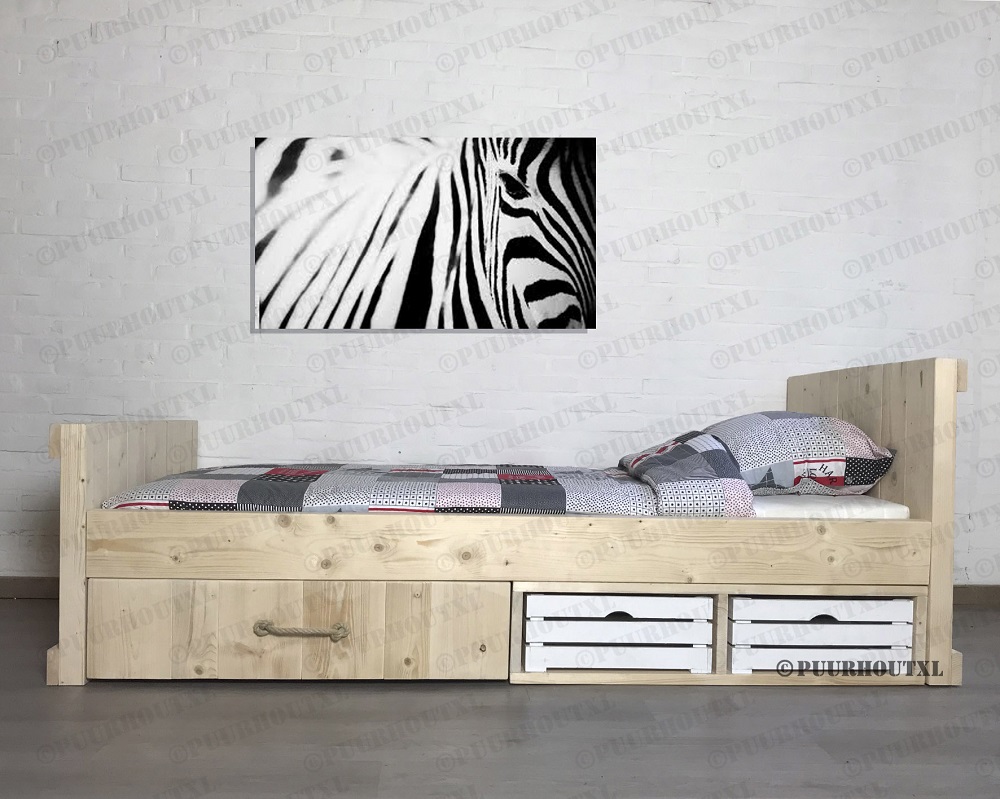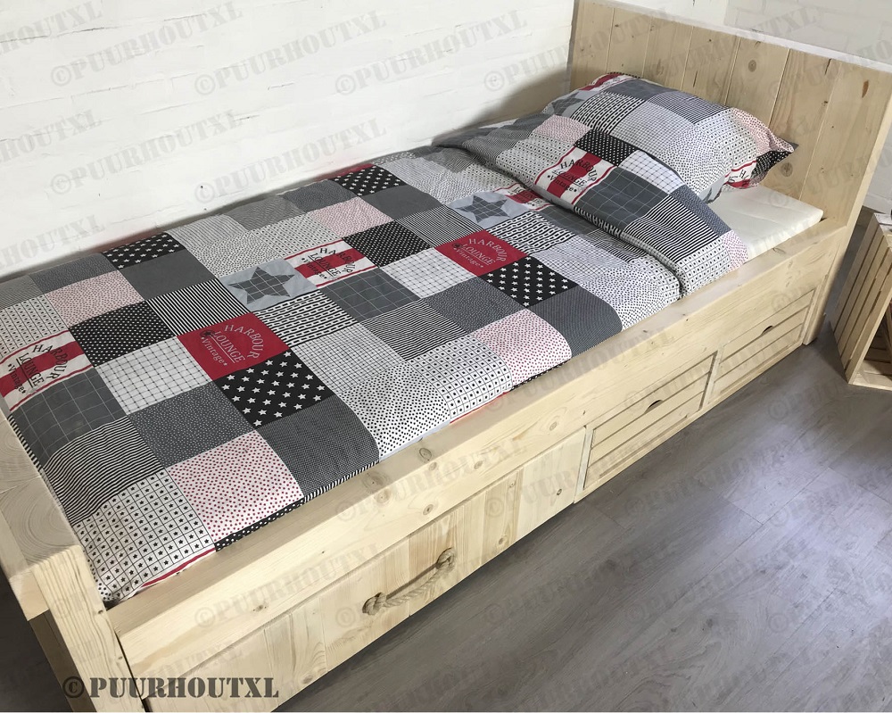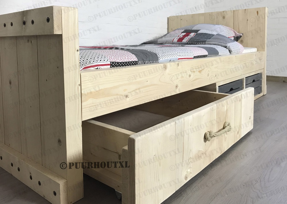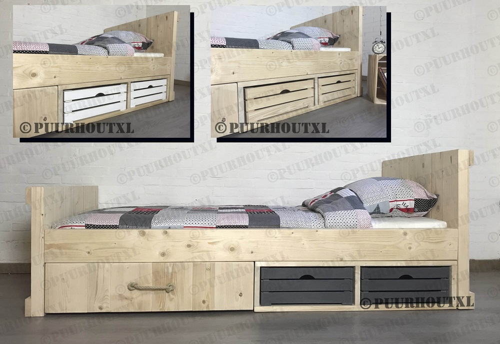Houten bed met opberg lade – Boris Naturel – Massief Vurenhout – Optionele Opbergkratten