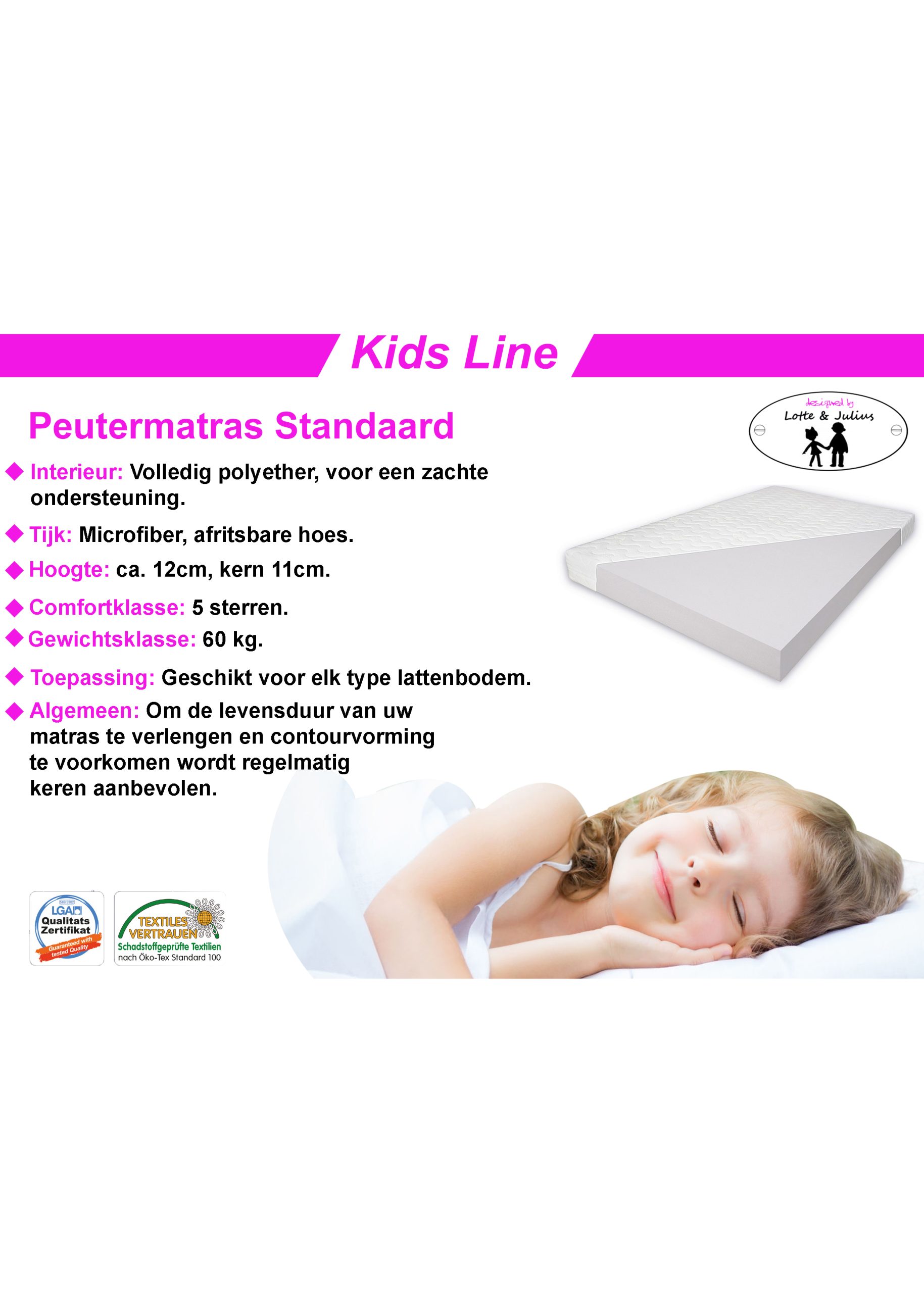 Dit peutermatras van Lotte & Julius heeft een kern van polyether comfort schuim en is 12cm dik.