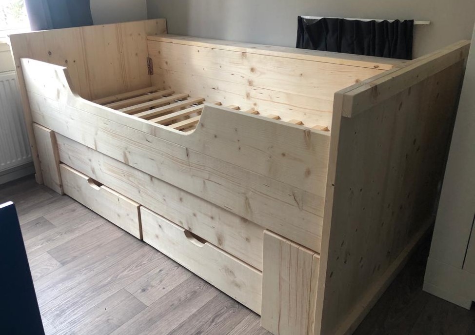 Super sterk kinderbed van massief hout met logeerlade en 2 opberglades